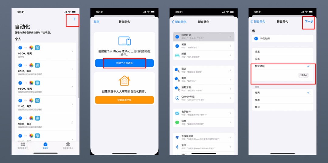 接下来点击快捷指令首页下方选项的第二个选项「自动化」,点击右上角加号,选择「创建个人自动化」,点击「特定时间」。将时间设置为每天,时间根据自己需求设置,点击「下一步」