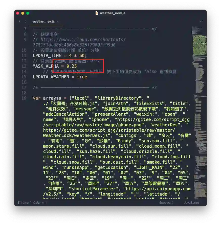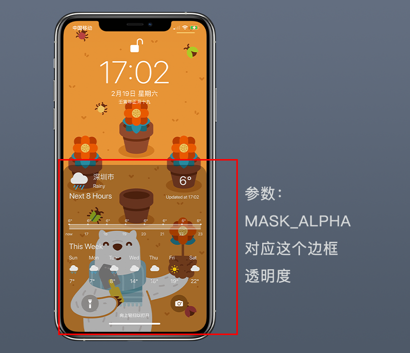 锁屏天气脚本的原作者是DJG,因为原版是英文,不喜欢英文界面所以把它改成中文了。脚本里面的MASK_ALPHA参数是边框透明度,可以修改为自己想要的透明度,范围:0~1