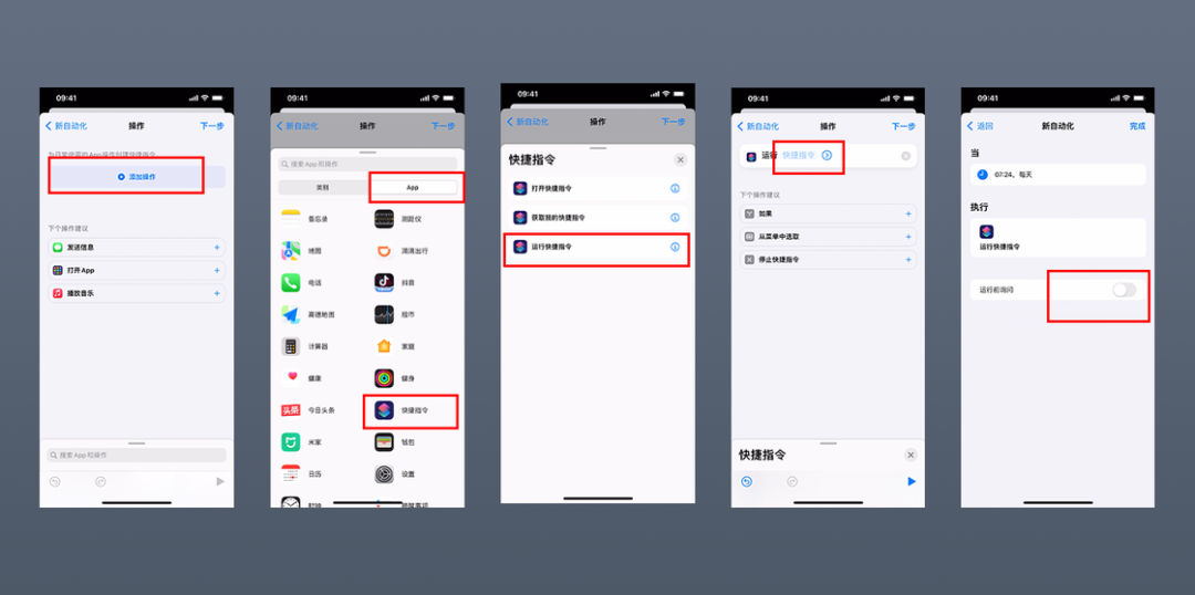 在接下来的页面选择「添加操作」,选择「App」选择,找到并选择「快捷指令」,选择「运行快捷指令」,下一步,点击「快捷指令」会出来选项,选择刚刚导入的快捷指令,下一步,关闭「运行前询问」开关按钮,完成。