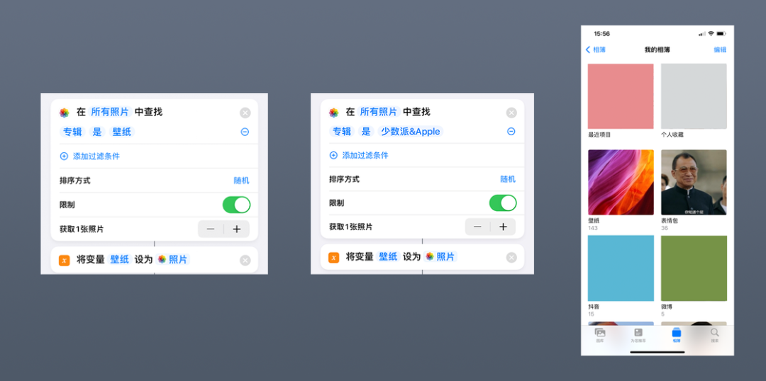 在快捷指令中,有一个流程是从名为「壁纸」的相簿中随机获取一张图片。这时候需要打开相册检查有没有名为「壁纸」的相簿。没有的话新建一个,把喜欢壁纸添加进去。或者修改成其他的相簿。