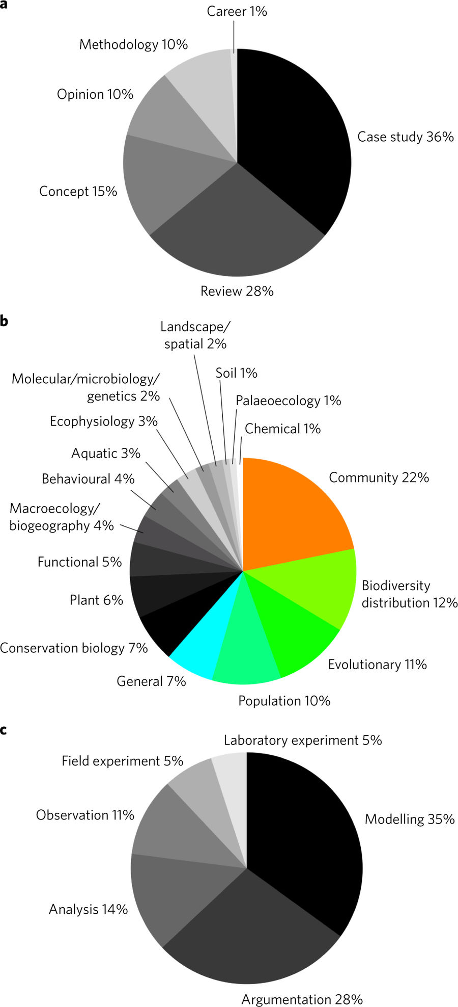 之所以加上引号,是因为,作者推荐的100篇文献较为陈旧,且较少,根本无法代表博大精深之生态学全貌。不过,在近期Nature Ecology & Evolution的这篇分析性文章中(研究论文“100 articles every PhD student should read”,链接:https://www.nature.com/articles/s41559-017-0370-9?WT.mc_id=COM_NEcoEvo_1711_Courchamp),作者列出的100篇他们认为“必读”的文献有一定的参考价值,我大致浏览了一下,涵盖了生态学的不少方面,有理论分析的,有模型研究的和概念性的论文。