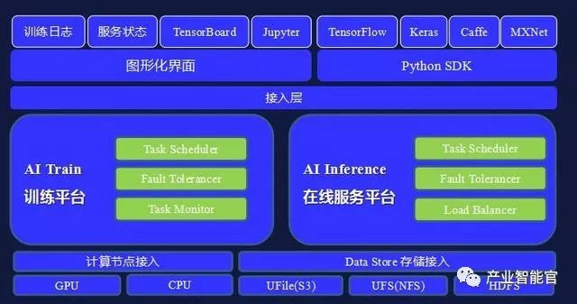 基于以上五大要素,UCloud构建了自有的AI基础平台,里面包含AI Train和AI Inference两大核心服务。如下图所示,最上层左侧是训练日志、服务状态、TensorBoard框架和Jupyter,下面接着就是图形化界面,这里面主要是完成一些基本的部署操作,右侧是Python SDK接口,接入层下面即为平台核心的AI Train和AI Service,最底层封装了所有的计算节点和存储接入。