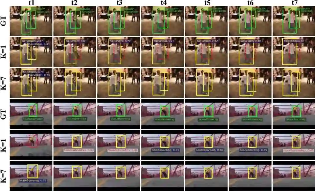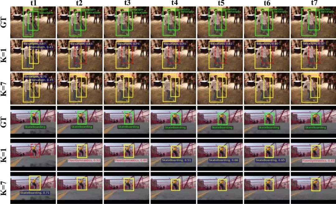 可视化结果展示:单帧(K=1)和tubelet (K=7)检测的例子。黄色方框显示检测结果,旁边提供分类和分数,黄色代表分类正确,红色代表分类错误。红色虚线框表示错过的演员。绿色方框和分类是ground truth。由于MOC-detector仅为一个tubelet生成一个分数和类别,因此分数和类别仅在tubelet (K=7)检测的第一帧中显示。