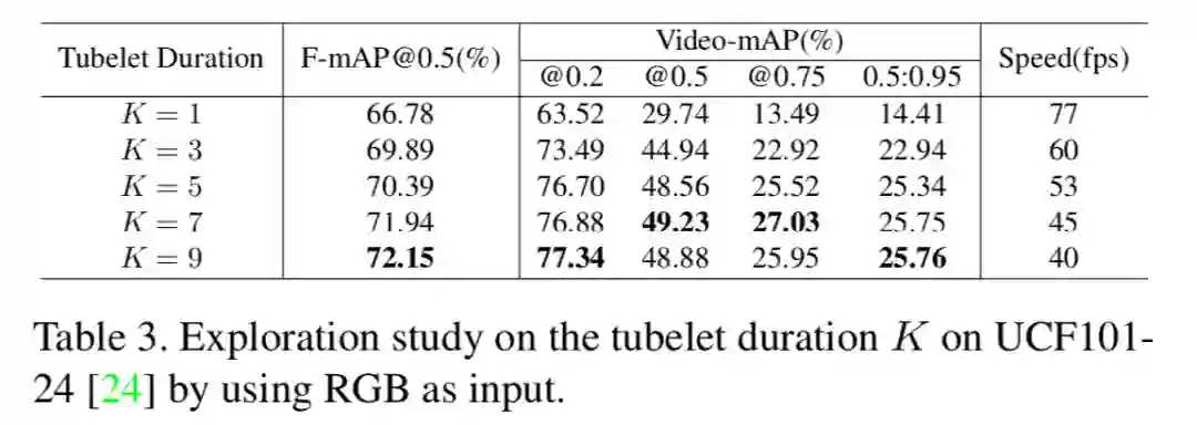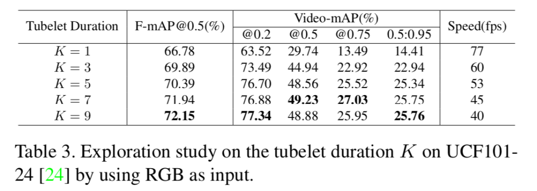 输入序列长度K的选择:不同K的选取可以显著影响框架性能,平衡精度和速度,最终选取K = 7,并且当K=1时,MOC-detector退化为单帧检测器,与K=7的效果相差很大,可知利用时序信息的tubelet detector更加有效。
