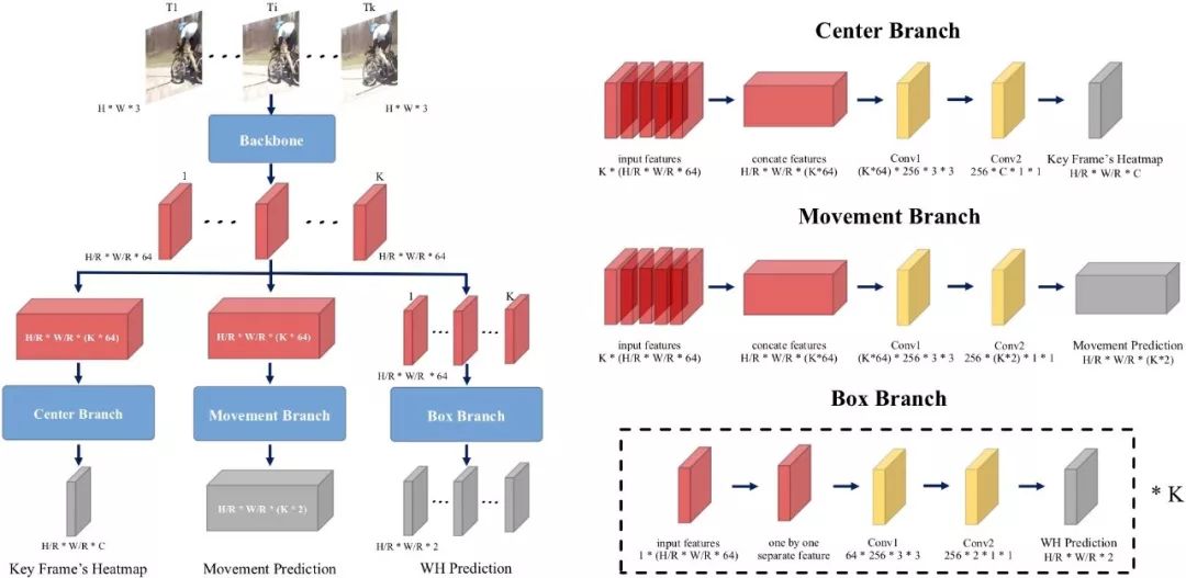 本文旨在提出一种新的anchor-free时空动作检测框架,利用视频中特有的时序动作信息,将动作实例视为其中心点的运动轨迹,并沿轨迹回归每一帧动作实例的包围框;具体来说,如上图所示将连续K帧图像分别输入共享的2D Backbone提取每一帧的高层语义特征,即K张特征图;
