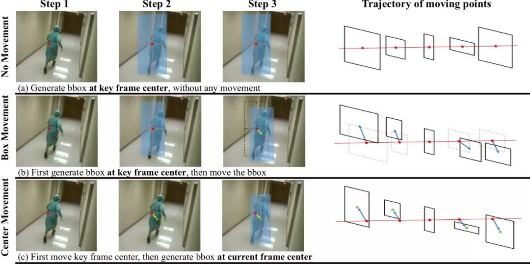中心移动(Center Movement)(MOC-detector采用此方式):首先根据运动估计分支的预测将动作实例的关键帧中心移动到当前帧中心,然后通过包围框回归分支在每帧的中心点生成包围框。中心移动和框移动的区别在于它们在不同的位置生成包围框:一个在真实的中心,另一个在固定的关键帧中心。