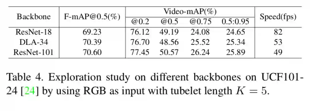 特征提取backbone的选取:对于不同的backbone,效果相差并不是很大,可见本文提出的MOC-detector框架对于backbone并不敏感,为平衡精度和速度,最终选取了DLA34作为backbone: