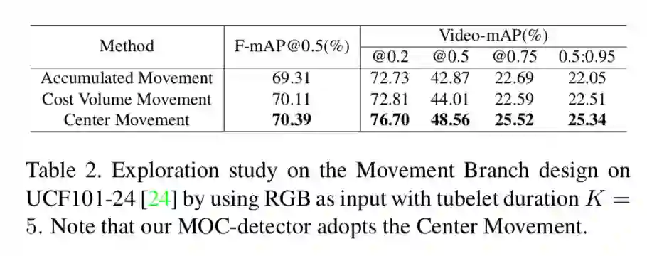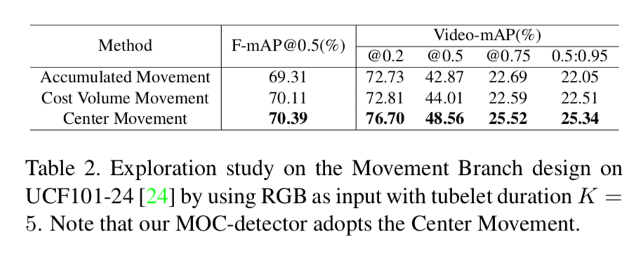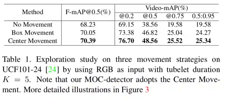 运动估计影响探究:MOC-detector是一个短时序的时空动作检测器,本文为了证明在短序的时空动作检测中运动信息依然很关键,设计了三种移动方式,示意图和实验结果如下: