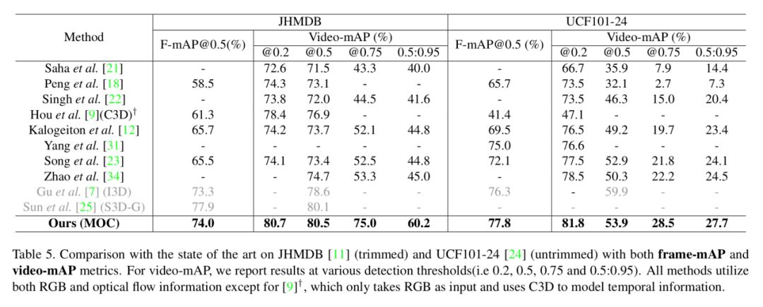 与sota的对比结果:标灰的两种方法使用了复杂的3D网络作为backbone(I3D和S3D-G),并在大型视频级数据集上进行预训练(如Kinetics),因此无法直接与其对比,但就算如此,从结果可以看出MOC-detector与他们效果comparable,并且大幅度领先目前基于2D结构的sota,特别是在高IoU要求上(video-mAP 0.75等)。