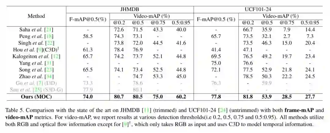 这三个分支可以相互协作生成tubelet检测结果,并采用现有的link算法,在UCF101-24和JHMDB数据集上得到了当前最好的效果,尤其是对于更精确的检测要求(高IoU, 如IoU=0.75),本框架大幅度领先sota方法。且因为同一个视频中每一帧的特征只需提取一次,之后对于不同的视频序列可重复使用,MOC-detector的效率也很高。