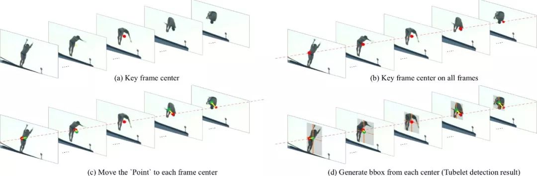 框移动(Box Movement):在一个tubelet中,首先以运动实例在关键帧的中心位置为每帧生成包围框,然后根据运动估计分支的运动矢量预测,移动每一帧中的包围框。该设计假设回归包围框的大小对于回归的中心位置不敏感,所有帧可以在与关键帧相同的位置回归。
