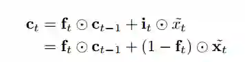 其中 f_t 和 i_t 属于 Sigmoid 门,它们分别被称为遗忘门(forget gate)和输入门。