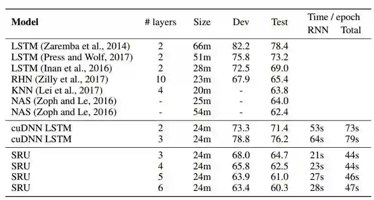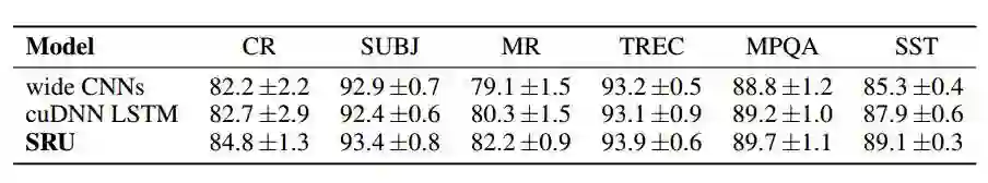 事实上,使用 SRU 训练一个较深的网络十分简单,因为每一层都只需要较少的计算力,并有较高的处理速度。