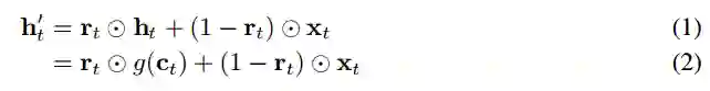 我们提出了完全 drop 连接,即在 h_t-1 和第 t 步神经门之间的连接。SRU 相关联的等式在下面给出: