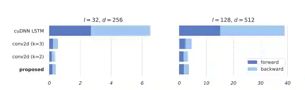 为了抵消显著增加的计算量,并行化方法比如 GPU 加速训练已经被广泛接受以缩放深度学习 (Diamos et al., 2016; Goyal et al., 201)。而诸如卷积和注意力等操作,虽然适用于多线程/GPU 计算,但循环神经网络仍然不太适应并行化。在典型的实现中,输出状态 h_t 一直处于闲置直到 h_t-1 的计算完成。这严重限制了独立计算,拖慢了序列处理的速度。图 1 举例展示了 cuCNN 优化的 LSTM(Appleyard et al., 2016),以及使用 conv2d 的单词级别卷积的处理时间。即使是优化的相当好的 LSTM 实现也慢了 10 倍,这是相当大的差距。