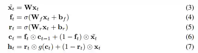 给定输入向量序列 {x_1, · · · , x_n},{x˜t,f_t, r_t} 对于不同的时间步 t=1,...,n 是独立的,因此可以并行计算所有这些向量。我们的方法和最近提出的 Quasi-RNN(Bradbury et al., 2017)十分相似。当我们在上方 3 到 5 表达式中的线性转换项 drop h_t-1 时,Quasi-RNN 使用 k-gram conv2d 运算来替代线性项。我们设计出的神经网络的瓶颈在于方程式 3 到 5 中间的三个矩阵乘法。在计算 x˜t、f_t 和 r_t 后,方程式 6 和 7 能够非常迅速和简洁的执行计算,因为它们的运算都是对应元素之间的操作。