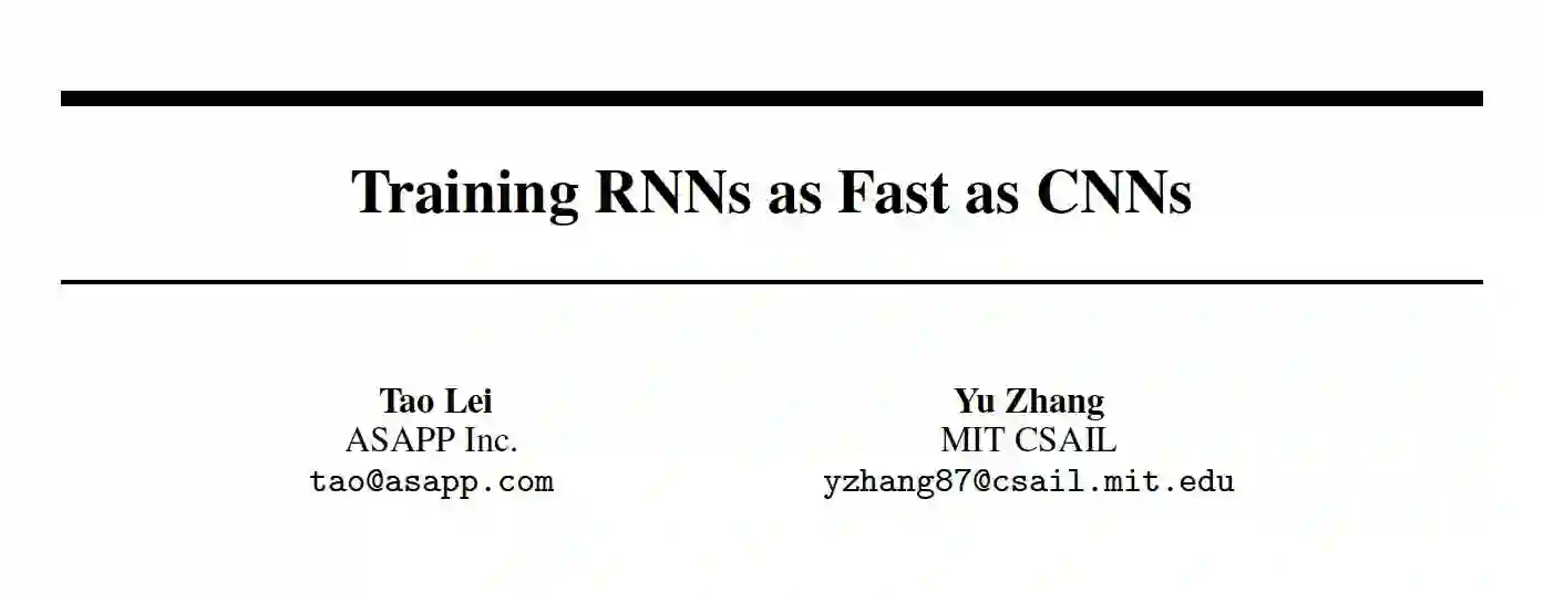 @article{lei2017sru, title={Training RNNs as Fast as CNNs}, author={Lei, Tao and Zhang, Yu}, journal={arXiv preprint arXiv:1709.02755}, year={2017} }