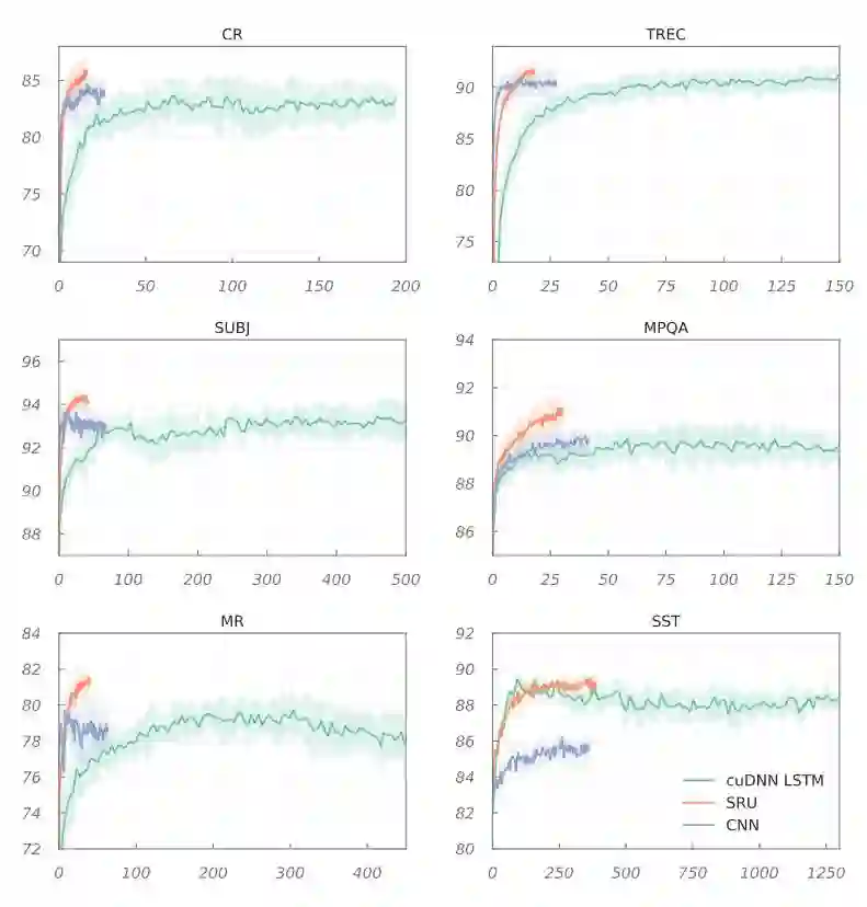 该项工作提出了 SRU,这是一个如同 CNN 一样快的循环模块,且易于扩展到超过 10 层。我们在 NLP 与语音识别任务上对其进行了大量测试,验证了其效率,并在 Github 上开源了我们实现以助力未来 NLP 与深度学习的研究。