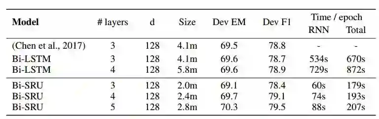 表 2:不同模型在 SQuAD 上的准确匹配率和 F1 得分。我们也报告了每个 epoch 的整体处理时间、RNN 使用的时间。SRU 有更好的结果,运算速度比 cuDNN LSTM 快了 6 倍。时间测定是在桌面电脑上完成的,配备了单个英伟达 GeForce GTX 1070 GPU 和英特尔 Core i7-7700k 处理器。