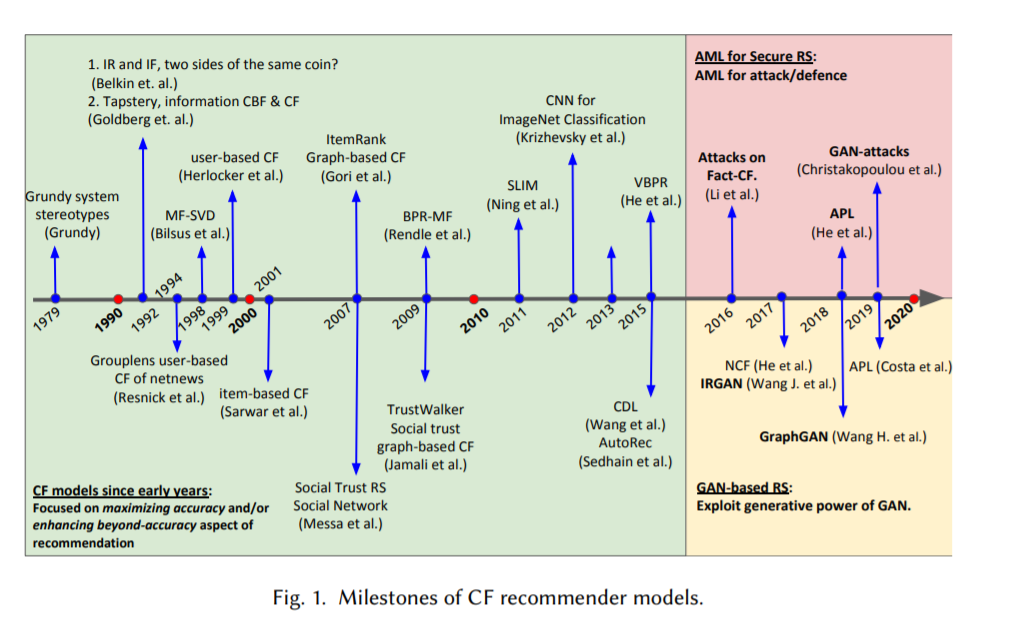 基于协同过滤(CF)的潜在因素模型(LFM),如矩阵分解(MF)和深度CF方法,由于其良好的性能和推荐精度,在现代推荐系统(RS)中得到了广泛的应用。尽管近年来取得了巨大的成功,但事实表明,这些方法易受对抗攻击的影响,即这是一种微妙但非随机的扰动,旨在迫使推荐模型产生错误的输出。这种行为的主要原因是,用于LFM训练的用户交互数据可能会受到恶意干扰或用户误操作的污染,从而导致不可预测的自然噪声和危害推荐结果。另一方面,研究表明,这些最初设想用于攻击机器学习应用程序的系统可以成功地用于增强它们对攻击的鲁棒性,以及训练更精确的推荐引擎。在这方面,本综述的目标有两方面: (i) 介绍关于AML-RS的最新进展,以保障AML-RS的安全性。(ii) 展示了AML在生成对抗网络(GANs)中的另一个成功应用,生成对抗网络(GANs)使用了AML学习的核心概念。在这项综述中,我们提供了一个详尽的文献回顾60篇文章发表在主要的RS和ML杂志和会议。这篇综述为RS社区提供了参考,研究RS和推荐模型的安全性,利用生成模型来提高它们的质量。