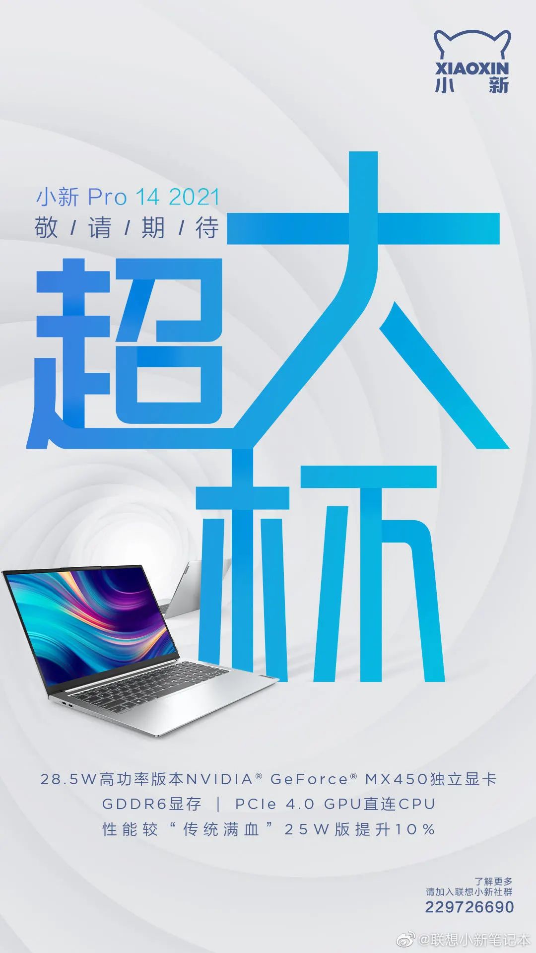 说完了更接近商务群体的几款轻薄本,接下来就轮到学生了,继小新Pro 13之后,联想又推出一款全新的小新Pro 14 2021 ,将小新Pro的产品线扩展到了最热门的14寸机型中。从配置表来看,这款小新Pro 14 2021 会用上英伟达最新的入门级独显MX450,用上了GDDR6的它在性能上已然接近了游戏本的级别。小新官方微博之前已经发布过相关的评测文章,称在“超大杯MX450”的加持下,轻薄本吃鸡并不再是梦想,而是“真正成为了现实”。