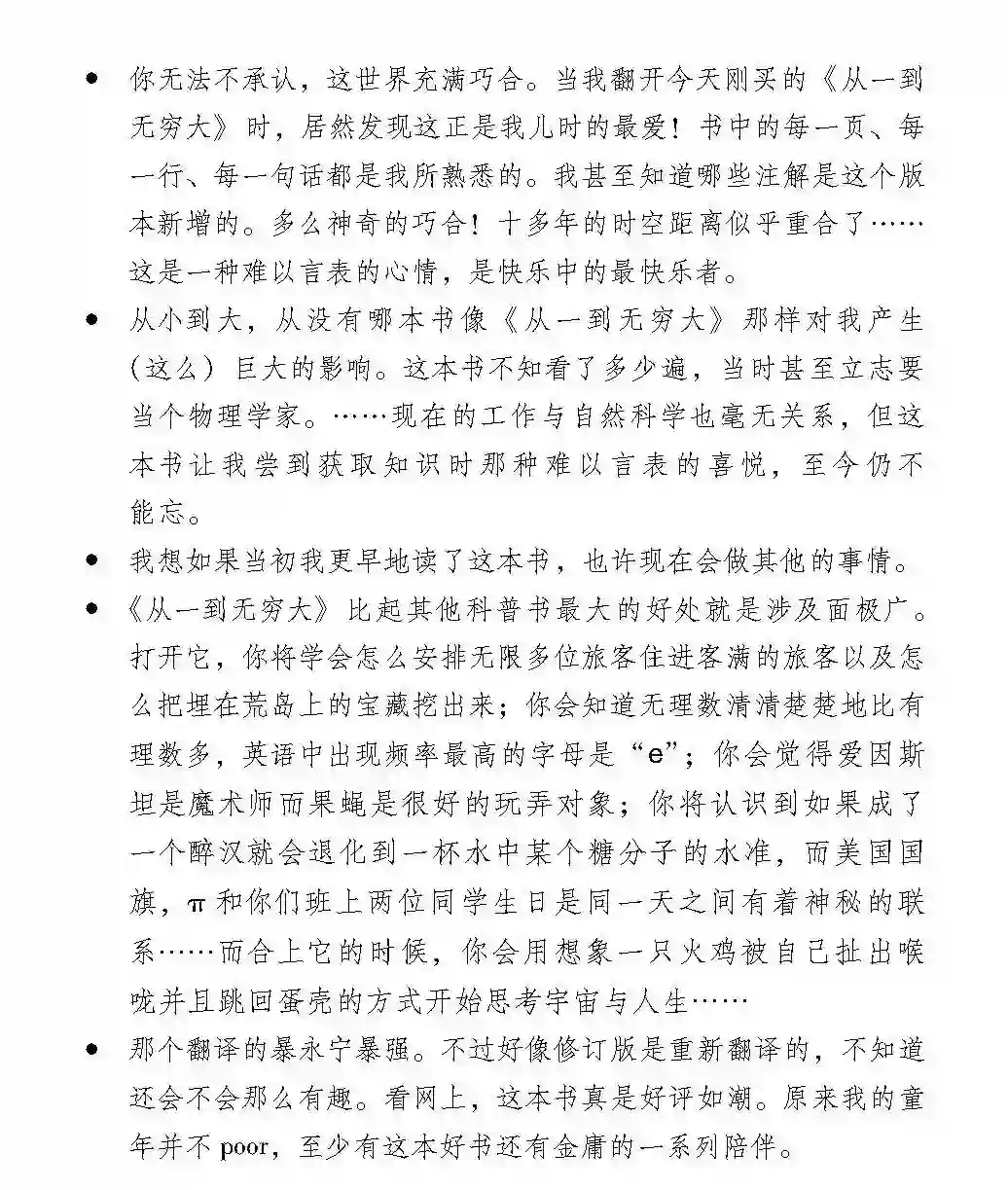 至今,我仍然认为《从一到无穷大》这本书是我所读过的最好的一本科普书。……这本书无论从其作者的身份、背景来说,还是从其自身的水准来说,在诸多的科普著作中,也都可以说是超一流的,连译者的文笔也颇为流畅,极有文采。