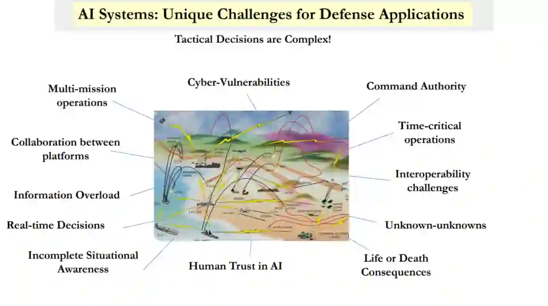 第一个为国防应用实施人工智能系统的独特挑战是战术战争呈现高度复杂的情况。战术复杂性可能涉及信息超载、需要处理的多个并发任务、具有可怕后果的时间关键决策、态势感知的未知/不准确/不完整,以及因各种分布式战争能力所需的互操作性而产生的工程挑战。将人工智能系统添加到这个已经很复杂的环境中是一项必要但极具挑战性的工作。