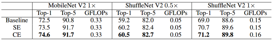 在高效的轻量级网络上,CE依然具有明显的优势。对于MobileNetV2,CE相比于SE在ImageNet上的top-1分类准确率提升了1.1(74.6 vs 73.5)。