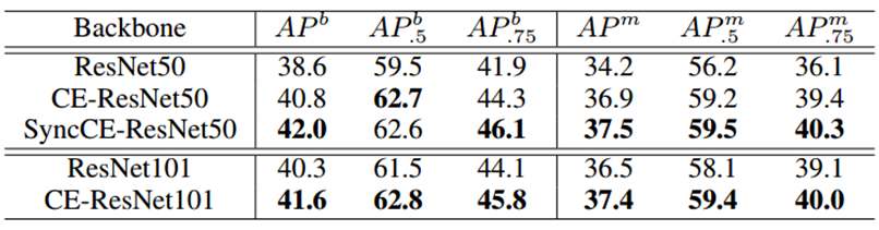 我们发现,CE可以很好的迁移到其他视觉任务中,比如物体检测,在Mask-RCNN框架下,使用预训练的ResNet50模型,多GPU同步的CE模块可以提升AP至42.0。
