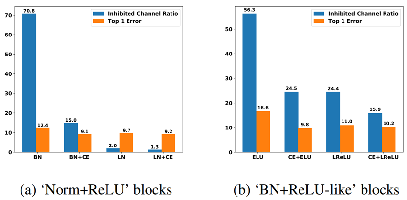 图1. 在训练后的VGG网络中,不同“Norm+ReLU-like”基本模块中的抑制通道比例