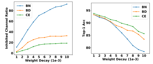 根据[7]中的经验,提高weight decay的强度可以增大网络中抑制通道的数量。我们发现,随着weight decay的增大,只使用BN的网络中的抑制通道数量增加,而引入本文提出的CE模块以及CE的子模块BD的时候,抑制通道数量显著降低,即使在很大的weight decay强度下,CE仍然能保持相对高的分类准确性。