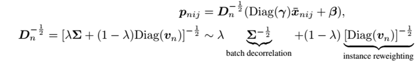 具体而言,CE采用去相关(Decorrelation)的方法白化归一化层的输出,使得导出的特征图的协方差矩阵成为单位矩阵,这样不同通道在量级上就变得各项同性了。与之前的去相关方法不同的是,CE在在批量估计的协方差矩阵的对角上引入自适应的条件方差,为每个输入单独计算协方差矩阵,从而实现样本特异的去相关操作。基于这样的设计,CE可以分为两个互补的分支,批量去相关(BD)和实例再加权(IR),用公式可以表述为: