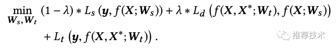 其中下标s表示student,d表示distillation,t表示teacher。从公式可以看出,教师网络的输入里包含普通特征和优势特征。这个公式下是将教师网络先训练好,然后指导学生网络。也可以同步更新教师网络和学生网络,减少训练时长,则公式如下: