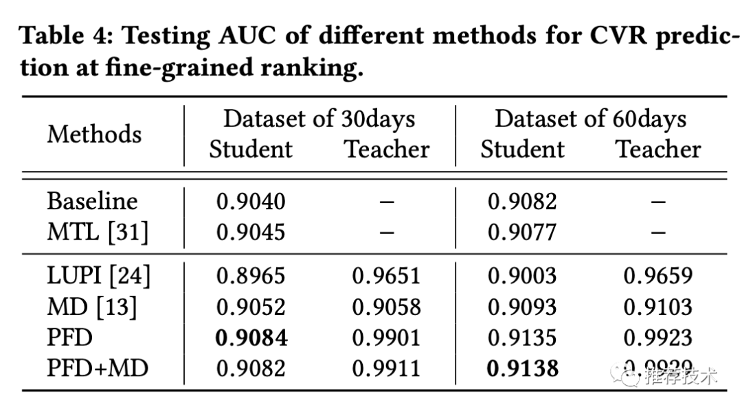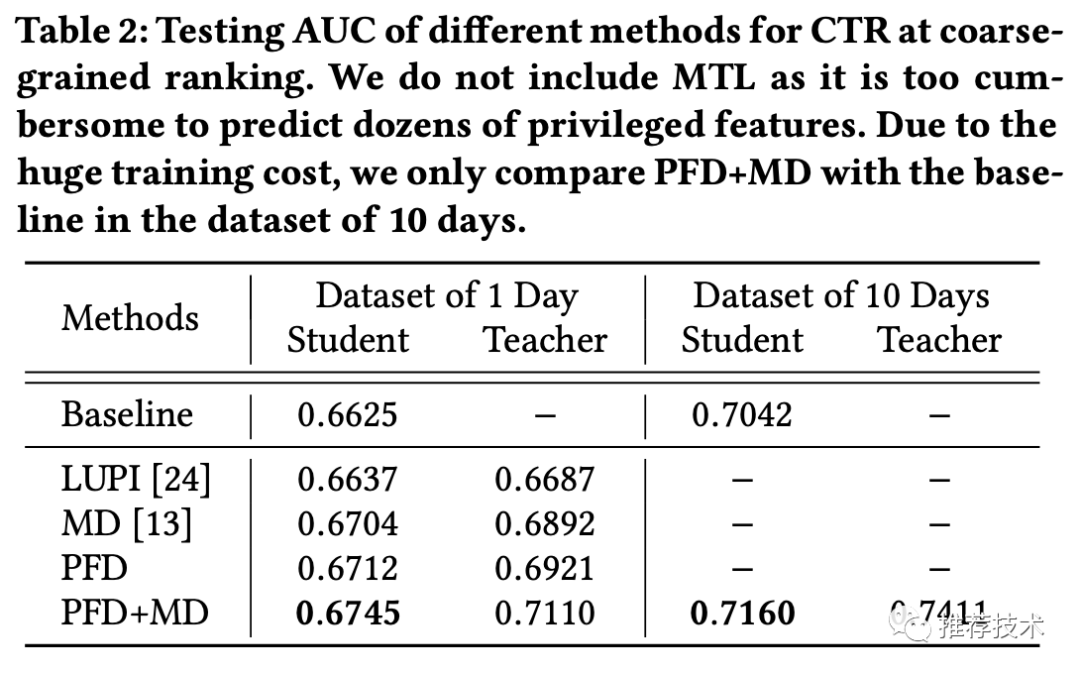 统一蒸馏:走到这里,可以考虑将MD和PFD合在一起做进一步提升了。更强的教师模型怎么选择呢?这里感觉还是比较巧妙的,本文直接拿精排的CTR模型来做粗排的教师模型,所以也就是让粗排反向学习精排的打分结果。