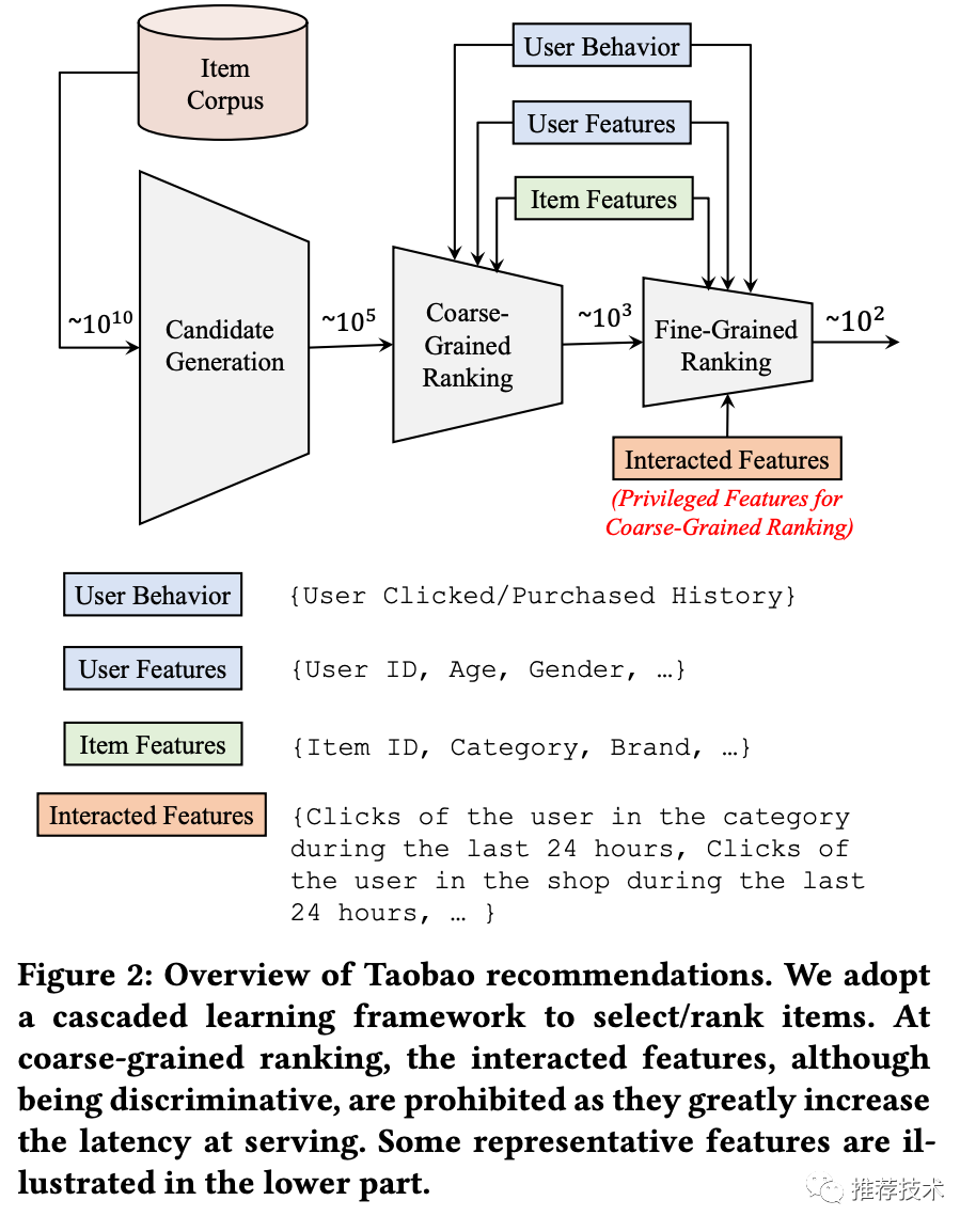 来看,这张图就是手淘推荐的流程框架图。所有的商品从入池到推荐给用户,会经历三个阶段:召回、粗排、精排。这三个阶段待打分的商品数会逐渐减少,模型会越来越复杂。