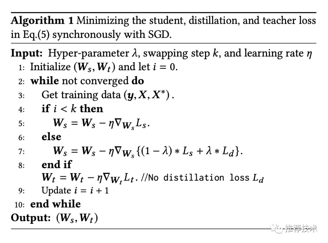 作者提到了这种方法可能带来训练的不稳定,尤其是训练初期,教师模型自己还没有学好,就来指导学生模型,是有可能导致训练偏离正常的。因此λ参数就很重要,初期可以设为0。算法流程如下: