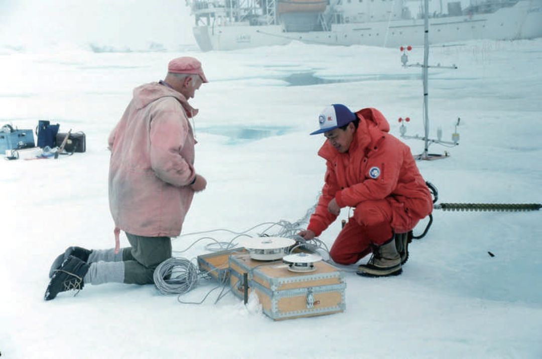 1991 年高登义研究员与Y·叶新教授(左)在北极浮冰上工作