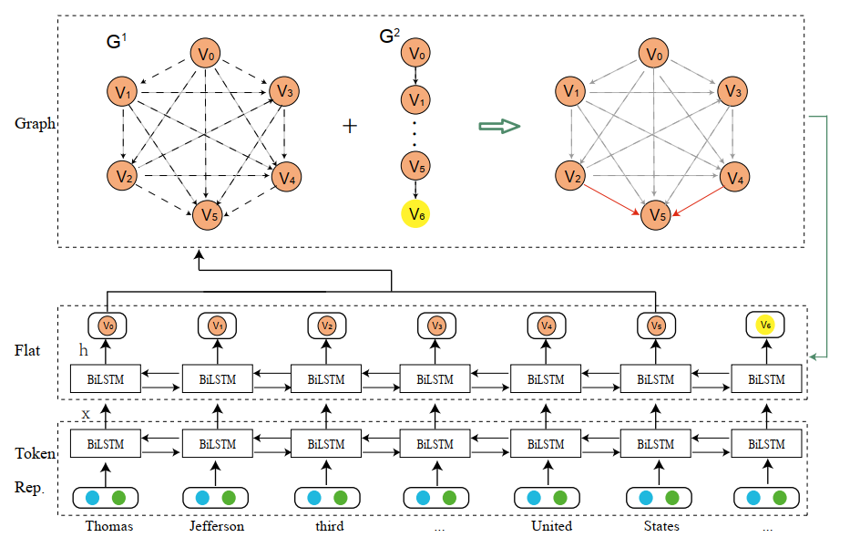 对于输入的Token序列 ,该模型首先需要通过Flat NER模块识别出最外层实体,然后根据最外层实体的识别结果构造出一个用于所有内层实体识别的图结构。假设Flat NER模块识别出序列 为一个最外层实体,那么我们就可以构造出一个顶点集合为 ,有向边集合为的图结构,图中的每条边就代表一个可能的内层实体的Span。接下来,我们就可以利用Bi-GCN对这个图的特征进行编码,并对图中的每条边进行分类,给每条边打上实体类型或非实体的标签,从而实现了内层实体的识别。