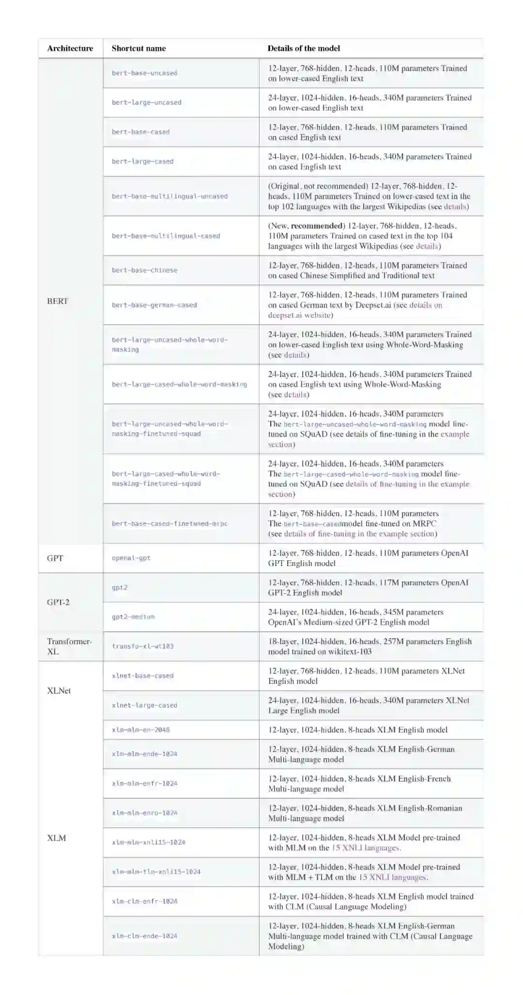 只需一个API,直接调用BERT, GPT, GPT-2, Transfo-XL, XLNet, XLM等6大框架,包含了27个预训练模型。