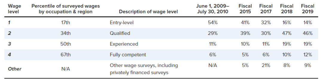 在 2019 财年,达到 Level 1 和 Level 2 薪资级别的 H-1B 岗位分别为 14%和 46%。