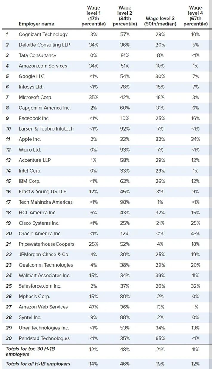 2019 财年的数据显示,在排名前 30 的 H-1B 雇主中,大多数 H-1B 工人的薪资低于工资中位数,具体如下: