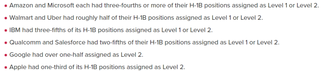 Ron Hira 等人今年 5 月份发表的一份 H-1B 薪资调查报告显示,大多数美国 H-1B 雇主,包括科技巨头微软、亚马逊、苹果、谷歌、Facebook 和 Uber 等在内,支付给海外工人的薪资都低于市场工资,要达到新规中的高薪资等级就更难了。