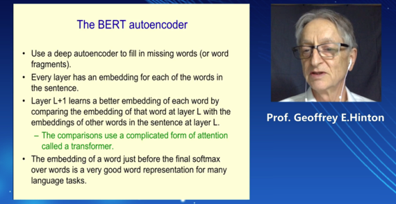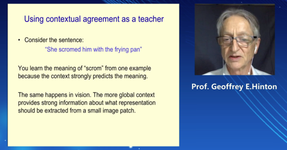 「上下文信息是最好的老师」。Hinton举例,「She scromed him with the frying pan」,即使我们没见过「scromed」,通过下文的平底锅,也能大概猜测出「scromed」的意思,拿个平底锅能干啥好事呢?
