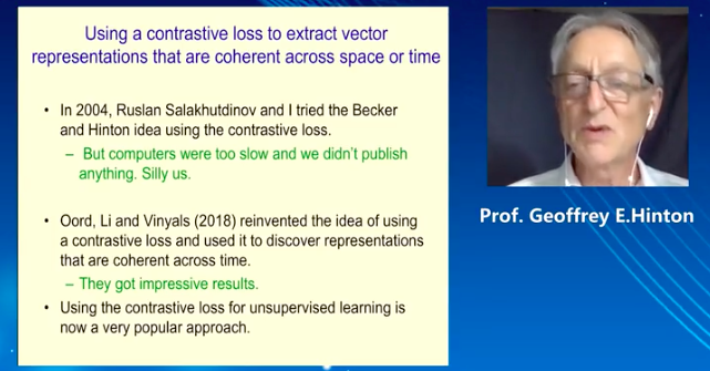 Becker和Hinton使用的优化互信息的方法也存在缺陷,后面Pacannaro和Hinton虽然用另一个方法替换了它也没能完全解决,但Hinton在本次演讲中提出了一个新的思路。