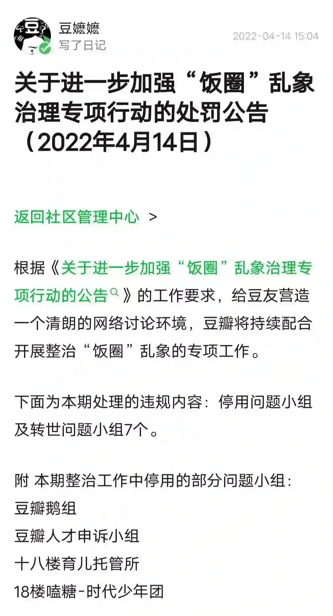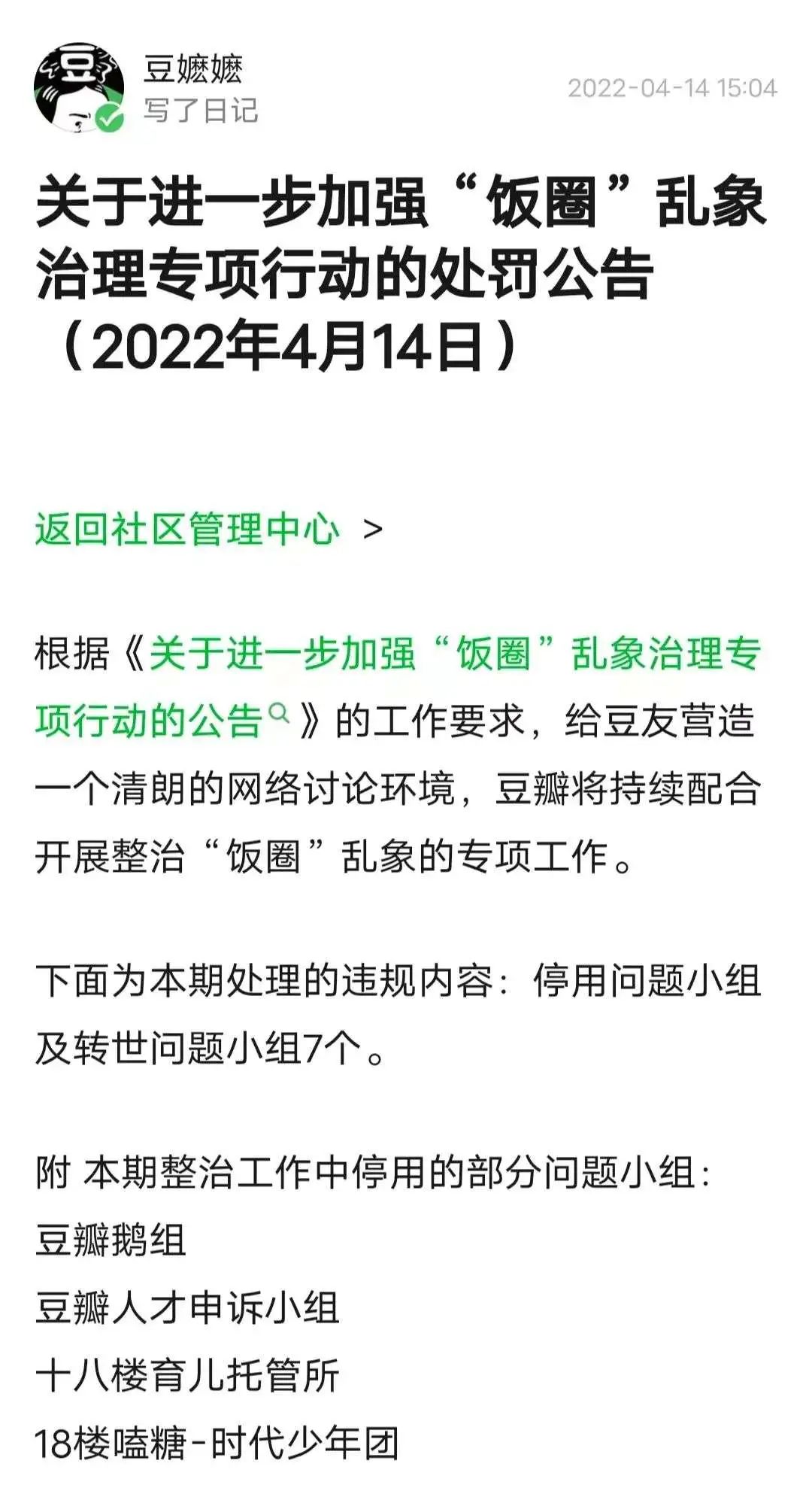 4月14日,豆瓣官方发布《关于进一步加强“饭圈”乱象治理专项行动的处罚公告》,宣布停用7个问题小组。其中,“豆瓣鹅组”赫然在列。