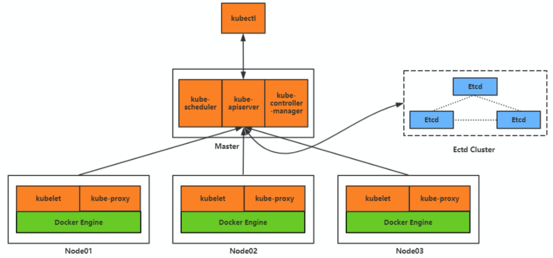 我们把 master 上提供管理接口的组件称为 kube apiserver,对应的还需要两个用于和 api server 交互的客户端,一个是提供给集群的运维管理员使用的,我们称为 kubectl;一个是提供给 worker 节点使用的,我们称为 kubelet。