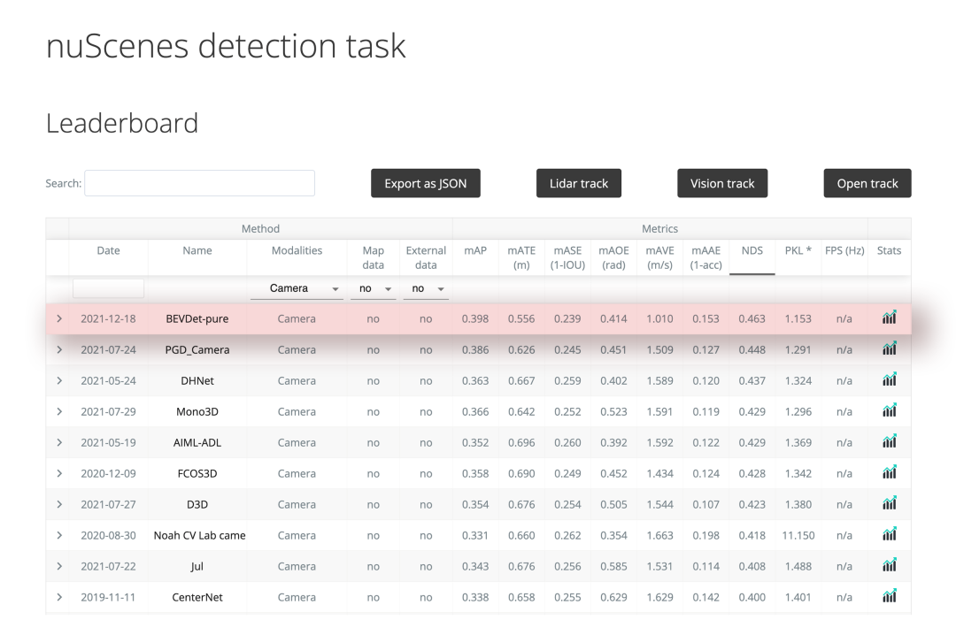 图 1:鉴智机器人提出的 BEVDet 在纯视觉 3D 目标检测赛道以绝对优势位列榜首(包括不加额外数据和加上额外数据两种评测模式)