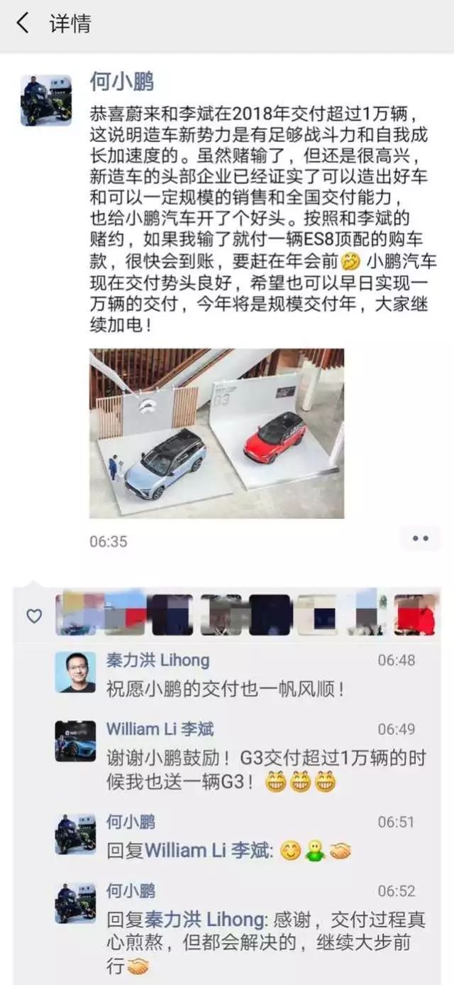何小鹏发朋友圈表示,恭喜蔚来和李斌,虽然赌输了,但还是很高兴。按照和李斌的赌约,将付一辆ES8顶配的购车款。李斌随后在此条信息下方进行评论,称谢谢小鹏鼓励,小鹏G3交付超过1万辆的时候自己也会送一辆G3给何小鹏。