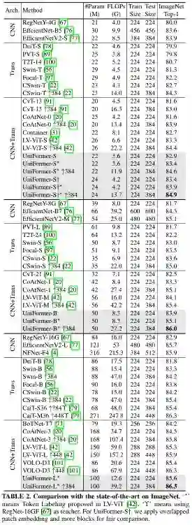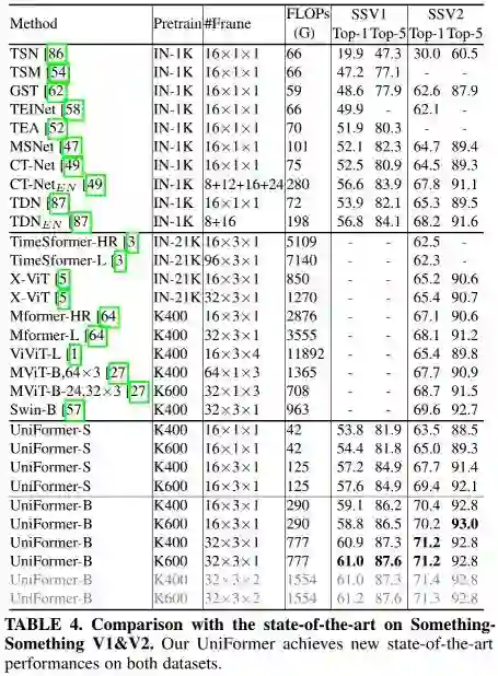 基于UniFormer模块,我们构建了一种新强力骨干并用于不同的视觉任务,包含图像与视频,分类与稠密预测。无需额外你训练数据,UniFormer在ImageNet数据及上取得了86.3%的精度;仅需ImageNet-1K预训练,它在诸多下游任务上取得了SOTA性能,比如Kinetics-400/600数据集上的82.9%/84.8%、Something-Something V1/V2数据集上的60.9%/71.2%、COCO检测任务上的53.8boxAP与46.4MaskAP、ADE20K分割任务上的50.8mIoU、COCO姿态估计上的77.4AP。