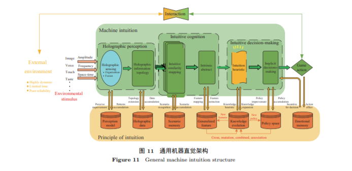 在此基础上, 设计实现了通用直觉架构的基本准则, 并分析了现有从管理学、决策论、计算机等领域所提出的直 觉实现架构的特点与不足. 接着, 我们提出一种受人类直觉启发的, 利用计算机模拟实现人类直觉并 可在复杂时变环境中利用包含大量噪声甚至不完备的信息进行快速而适宜决策的机器直觉的实现架 构. 最后, 对机器直觉未来发展方向和应用领域进行了展望. 本文的结构安排如下: 第 2 节综述人类 直觉的定义、类型, 各学科对直觉机理的研究现状以及直觉在人工智能领域的进展; 第 3 节设计了通 用直觉架构准则并论述了不同学科对直觉架构的探索; 第 4 节介绍本文所提出的机器直觉架构; 第 5 节探讨机器直觉的关键技术、发展方向与面对的挑战; 第 6 节对本文进行总结与展望.